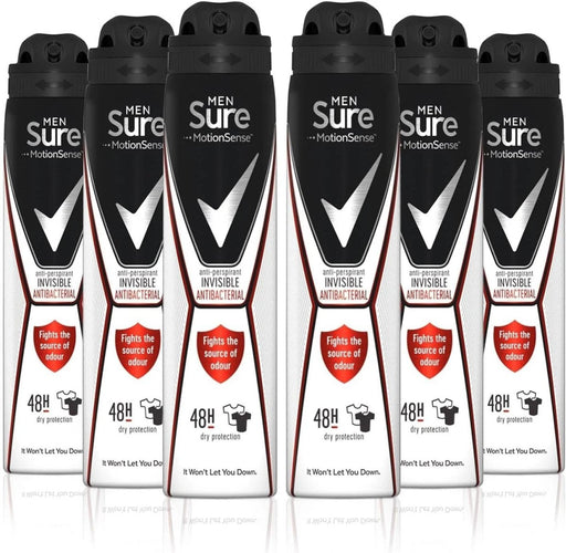 6x 250ml Sure Men INVISIBLE Antibacterial Odour Protection Anti-Perspirant Spray