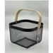 This Home Collections Mesh Basket with a Wooden handle in Black is a modern square-shaped storage unit made of Wood and Metal. It has one compartment, measuring, and The basket features a handle for easy carrying and is designed for free-standing use.